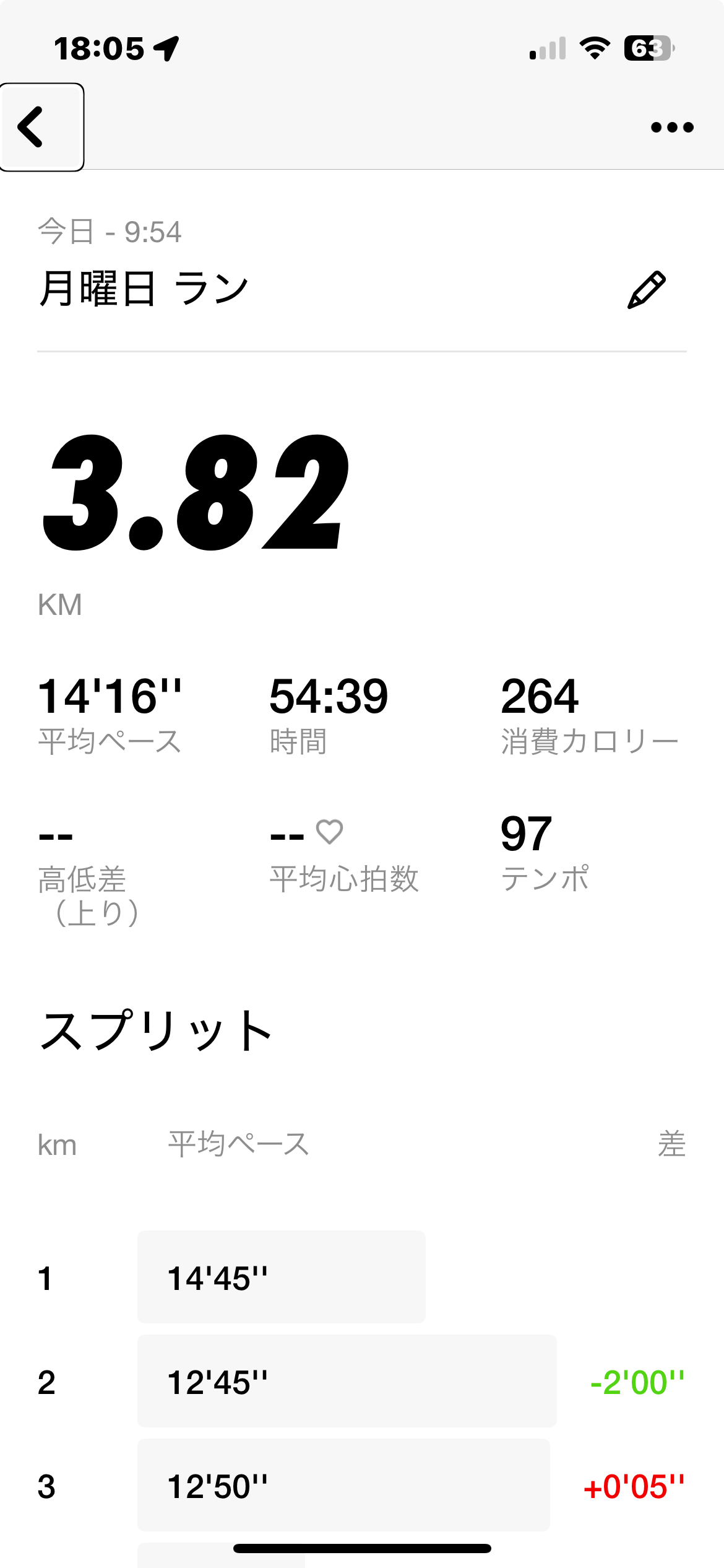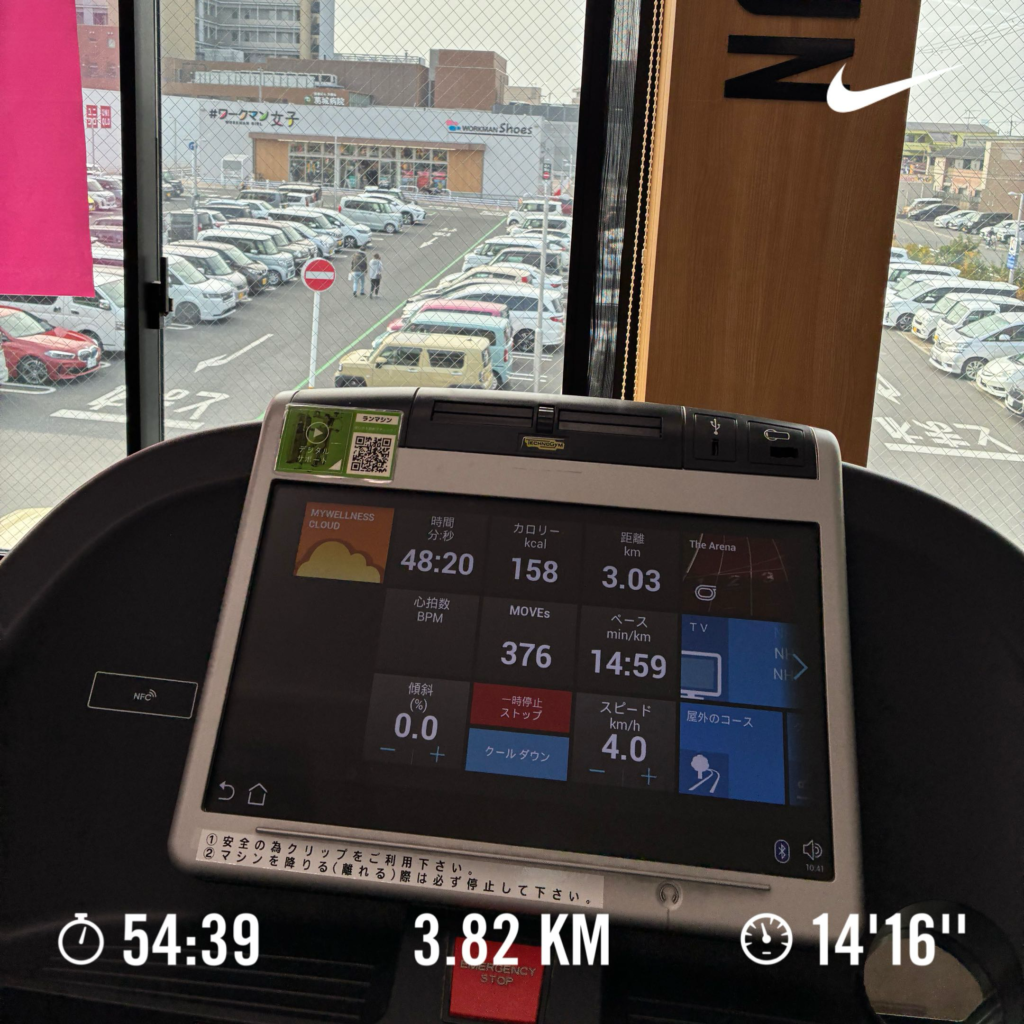 1/5(トレッドミル) 時間:54分、距離:3.8km、ペース:キロ14分16秒
