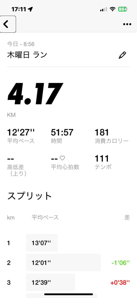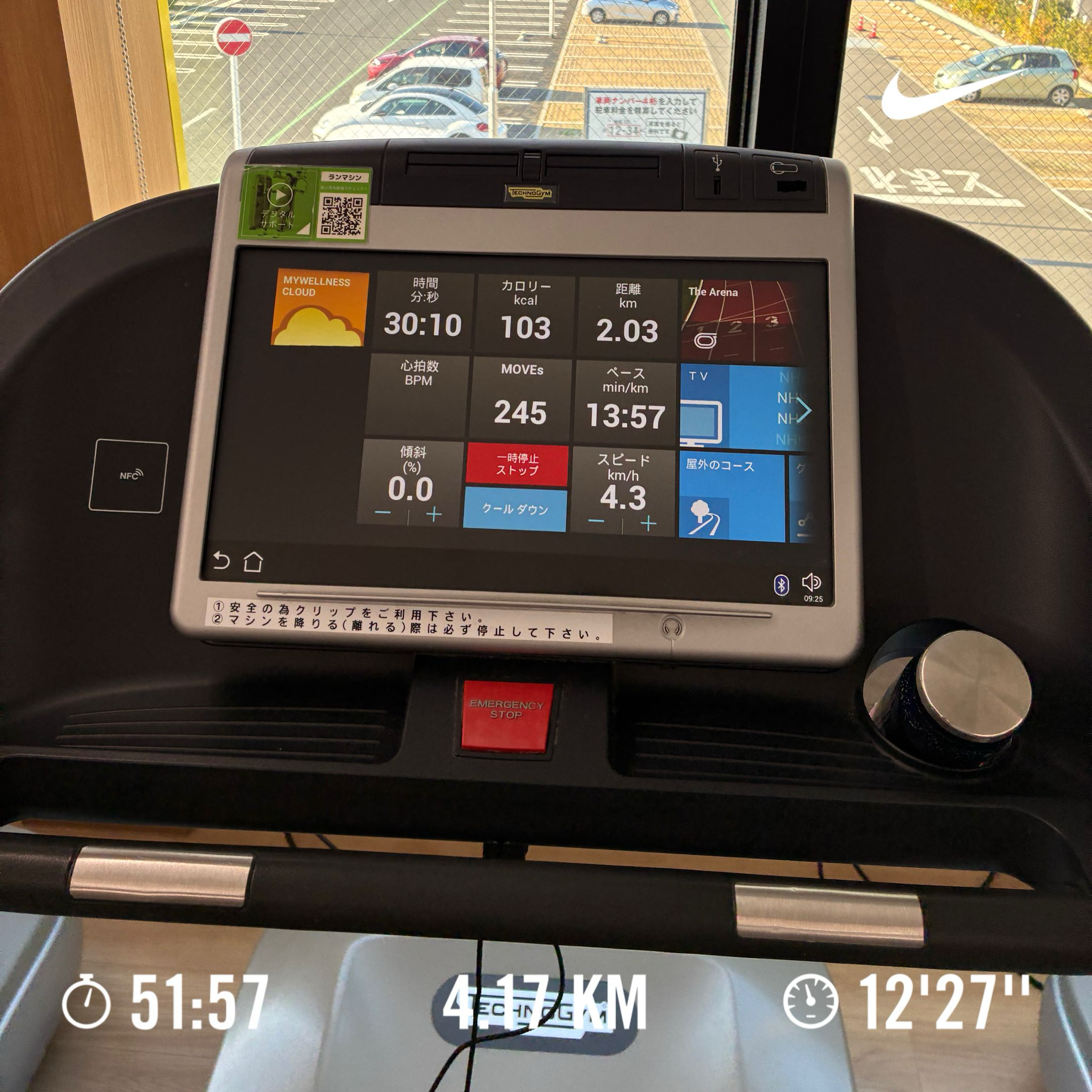 トレッドミル 時間:52分、距離:4.2km、ペース:キロ12分27秒