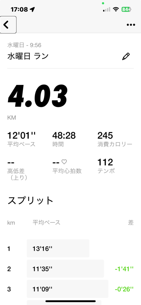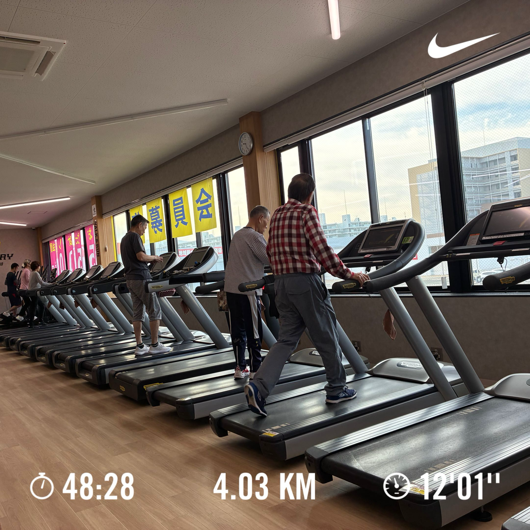 トレッドミル 時間:48分、距離:4km、ペース:キロ12分1秒