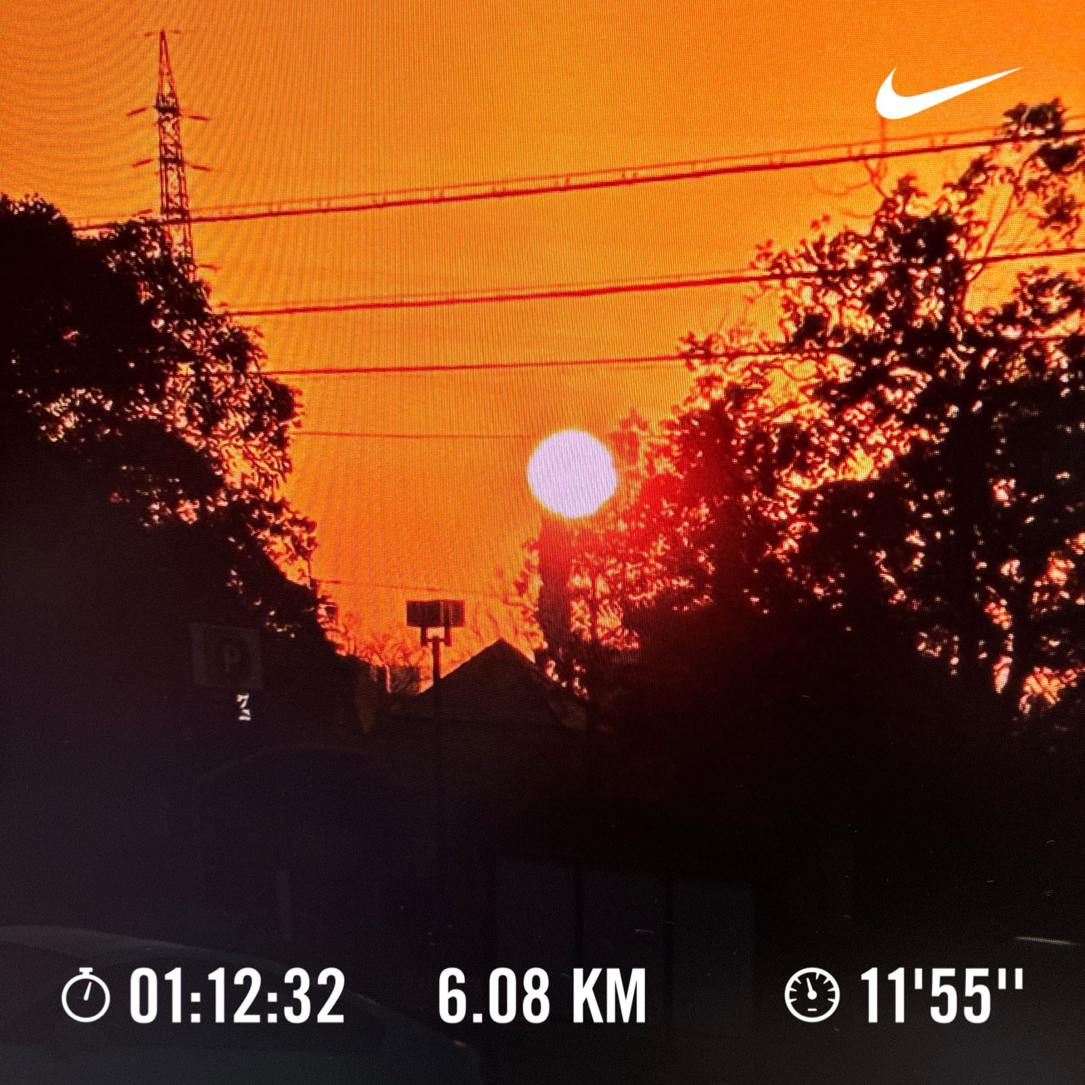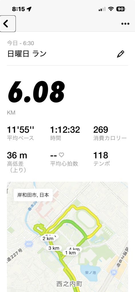 屋外ウォーキング 1時間12分、距離:6km、ペース:キロ11分55秒