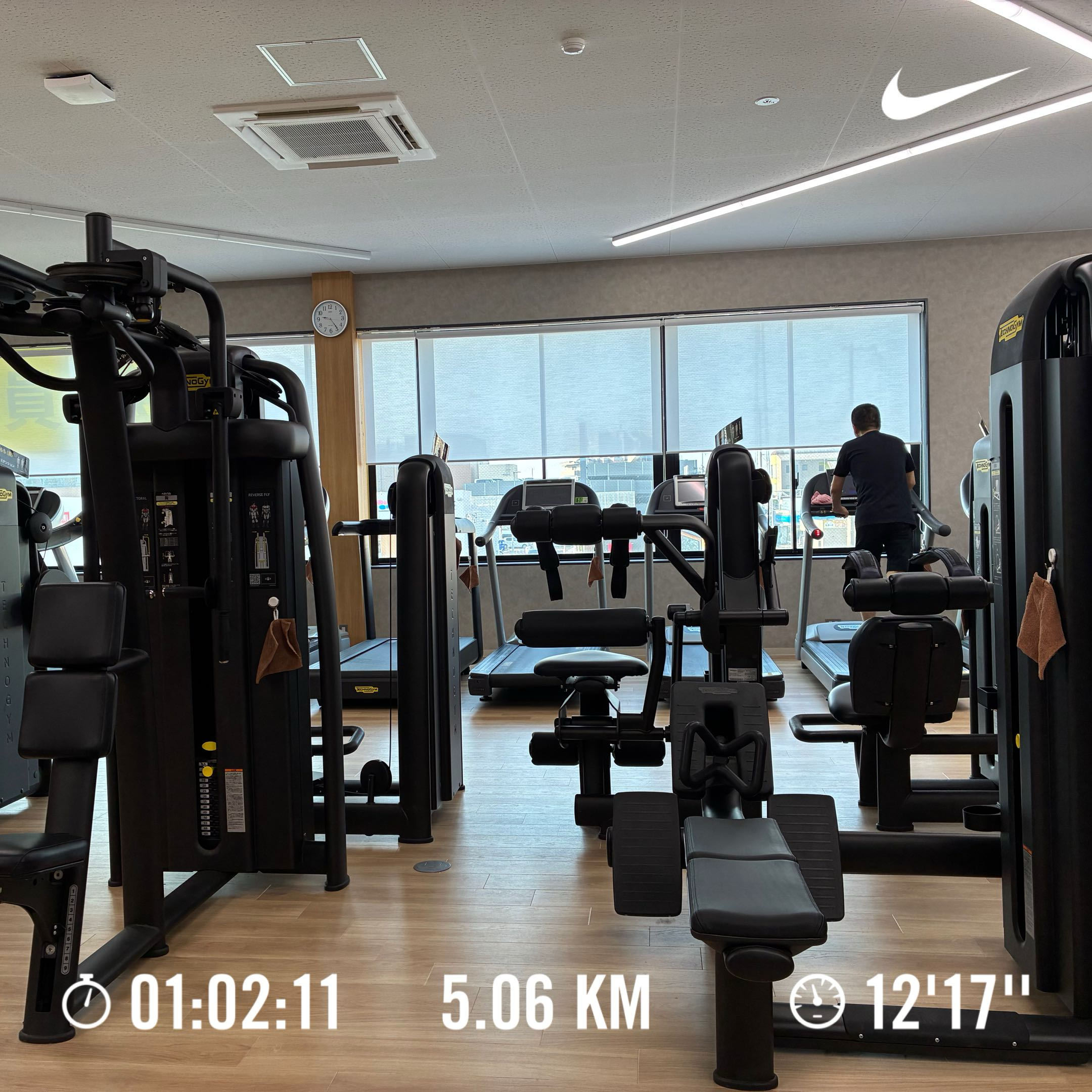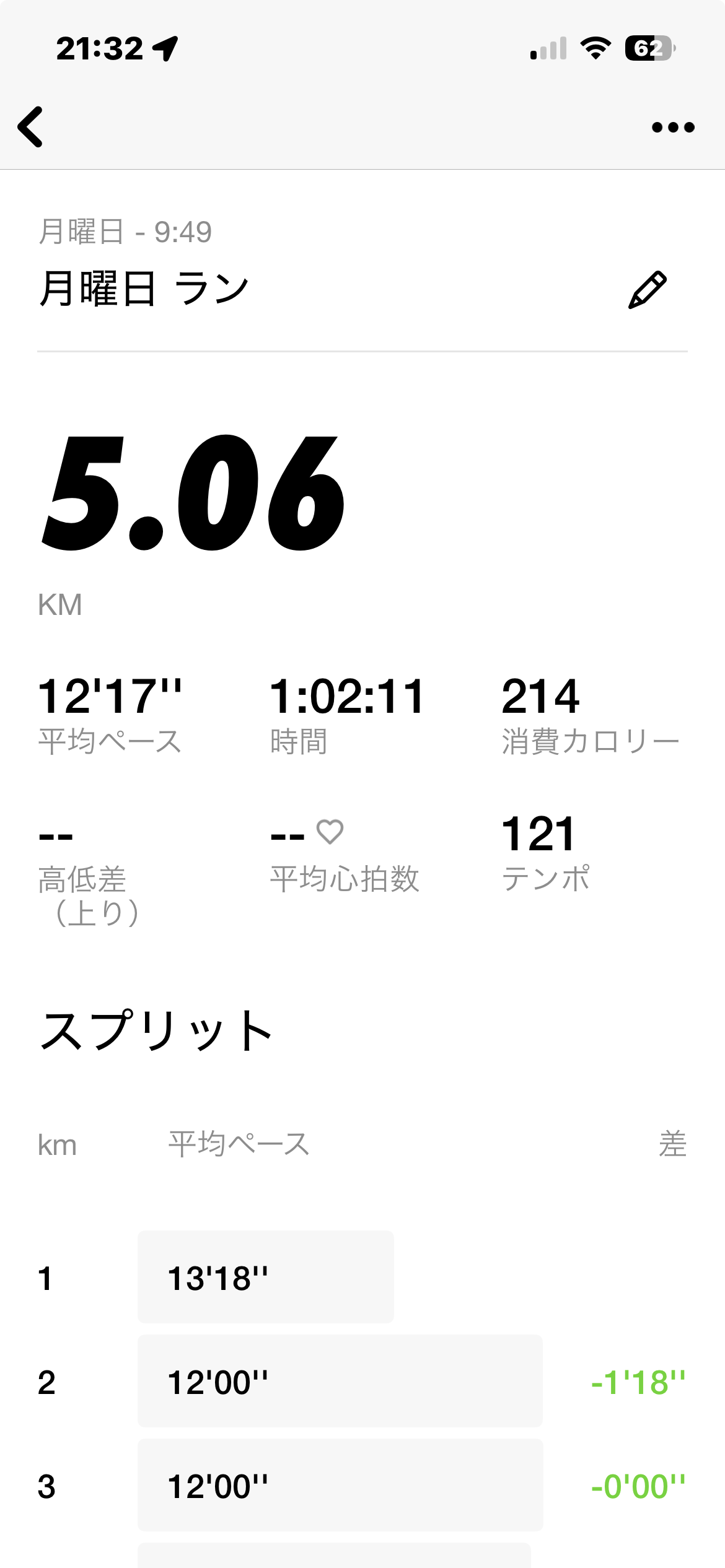 トレッドミル:1時間2分、距離:5km、ペース:キロ12分17秒