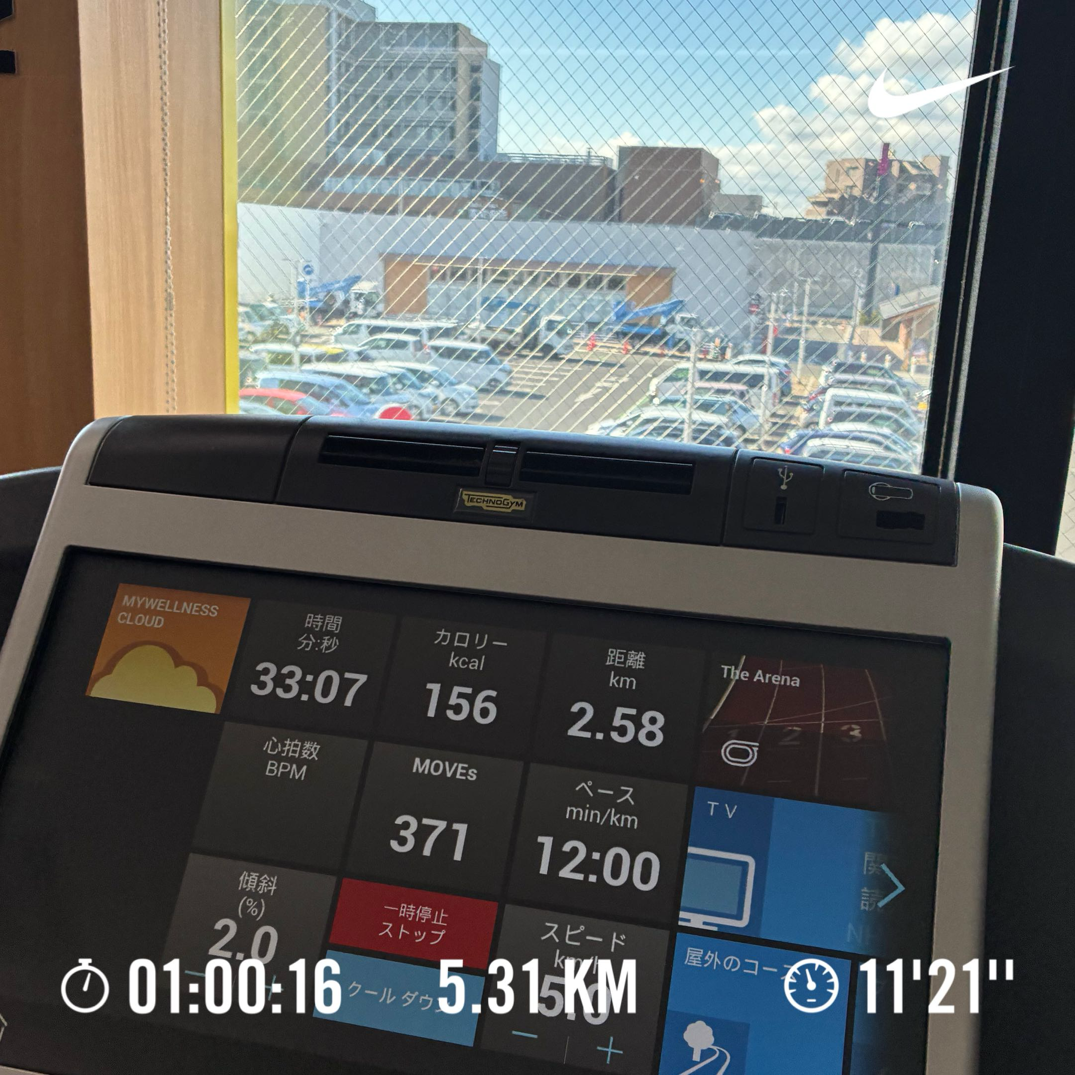 トレッドミル:1時間0分、距離:5.3km、ペース:キロ11分21秒