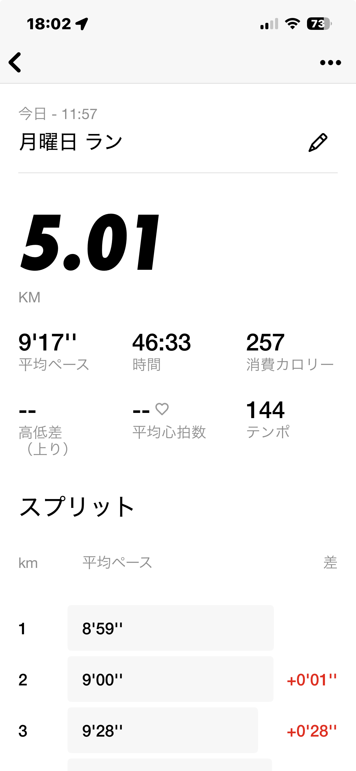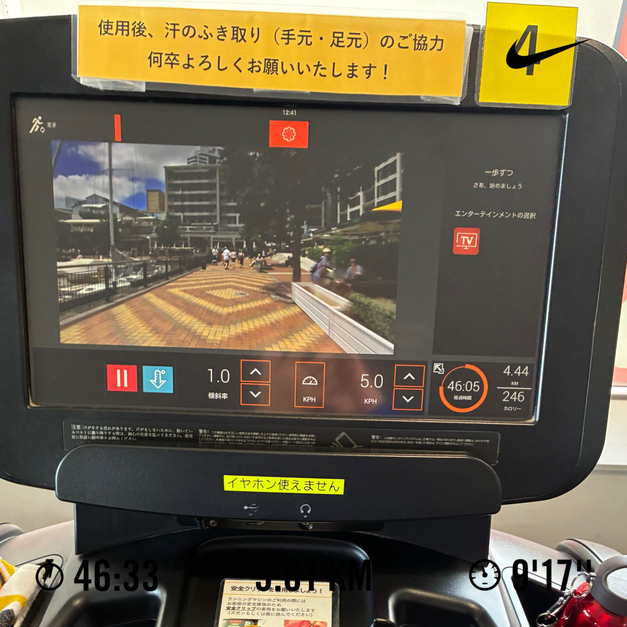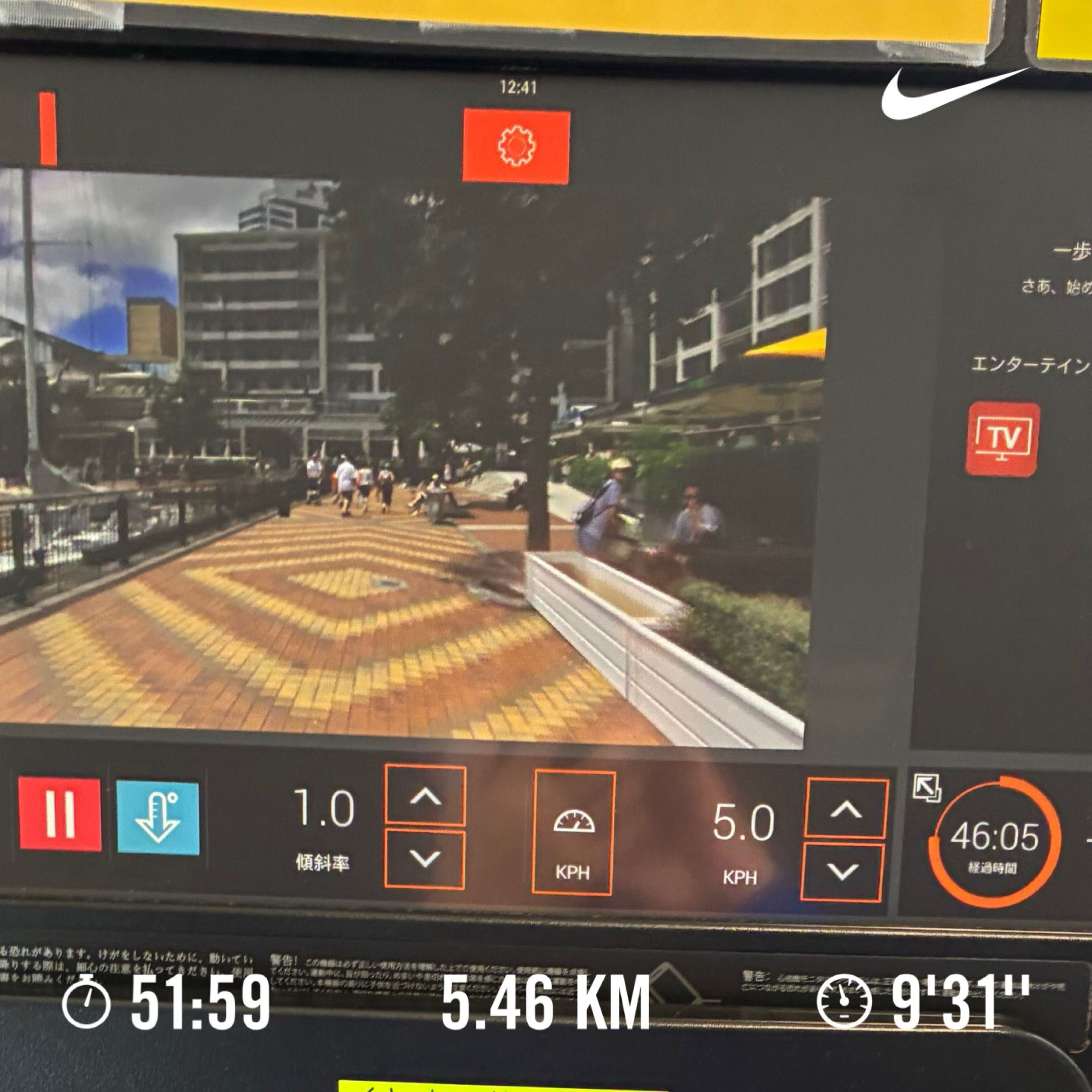 トレッドミル:46分、距離:5km、ペース:キロ9分17秒