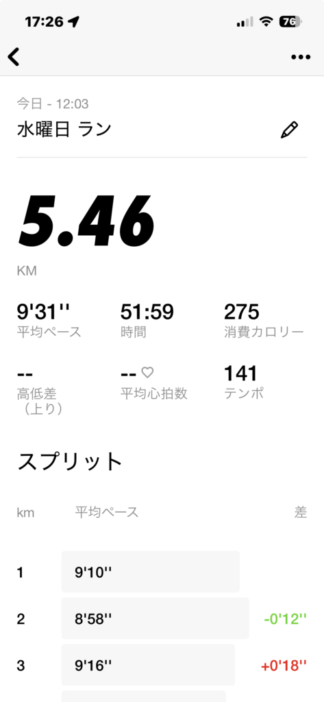トレッドミル:51分、距離:5.5km、ペース:キロ9分31秒