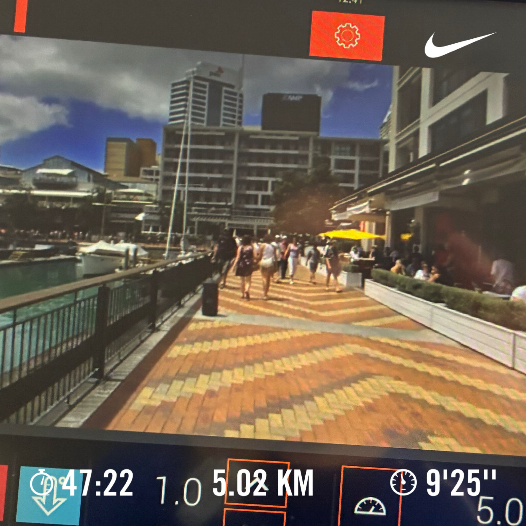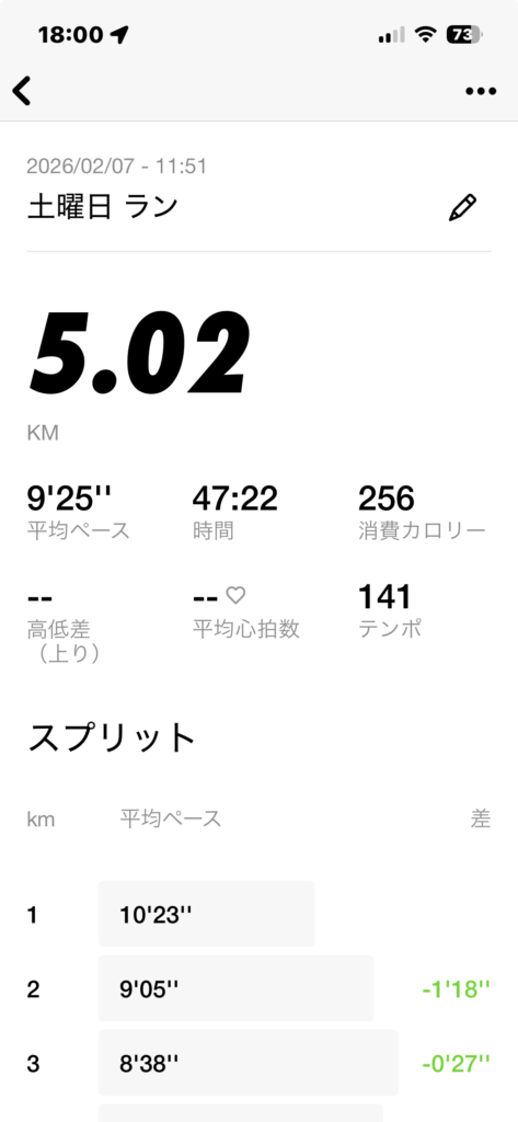トレッドミル:47分、距離:5km、ペース:キロ9分25秒