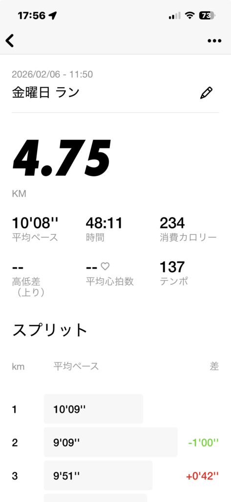 トレッドミルは速度の調整がしやすいですしね。10分歩いて10分走るの繰り返しを2回していますが、走るのは時速7km(キロ8分34秒)までにしています。
