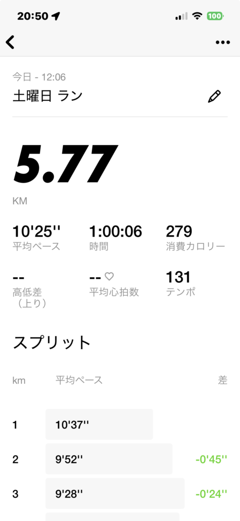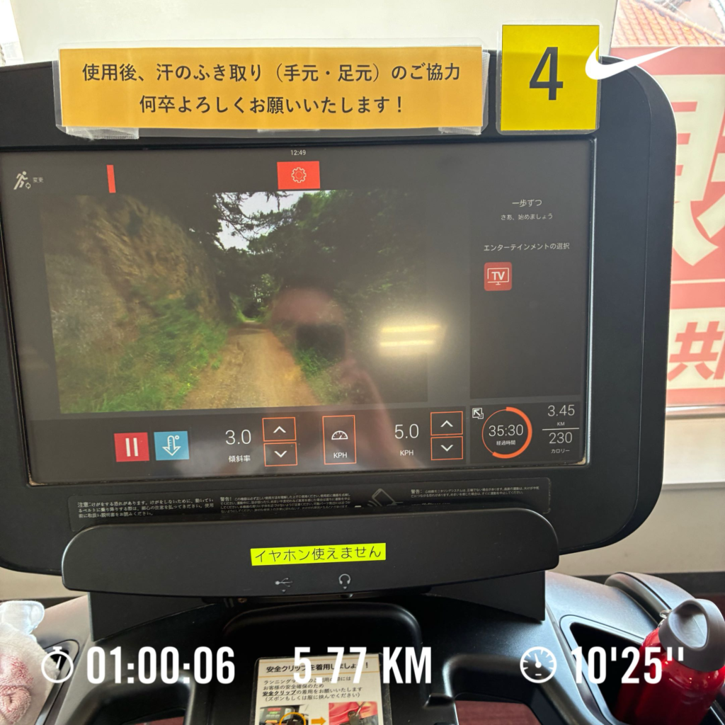 トレッドミル:60分、距離:5.8km、ペース:キロ10分25秒