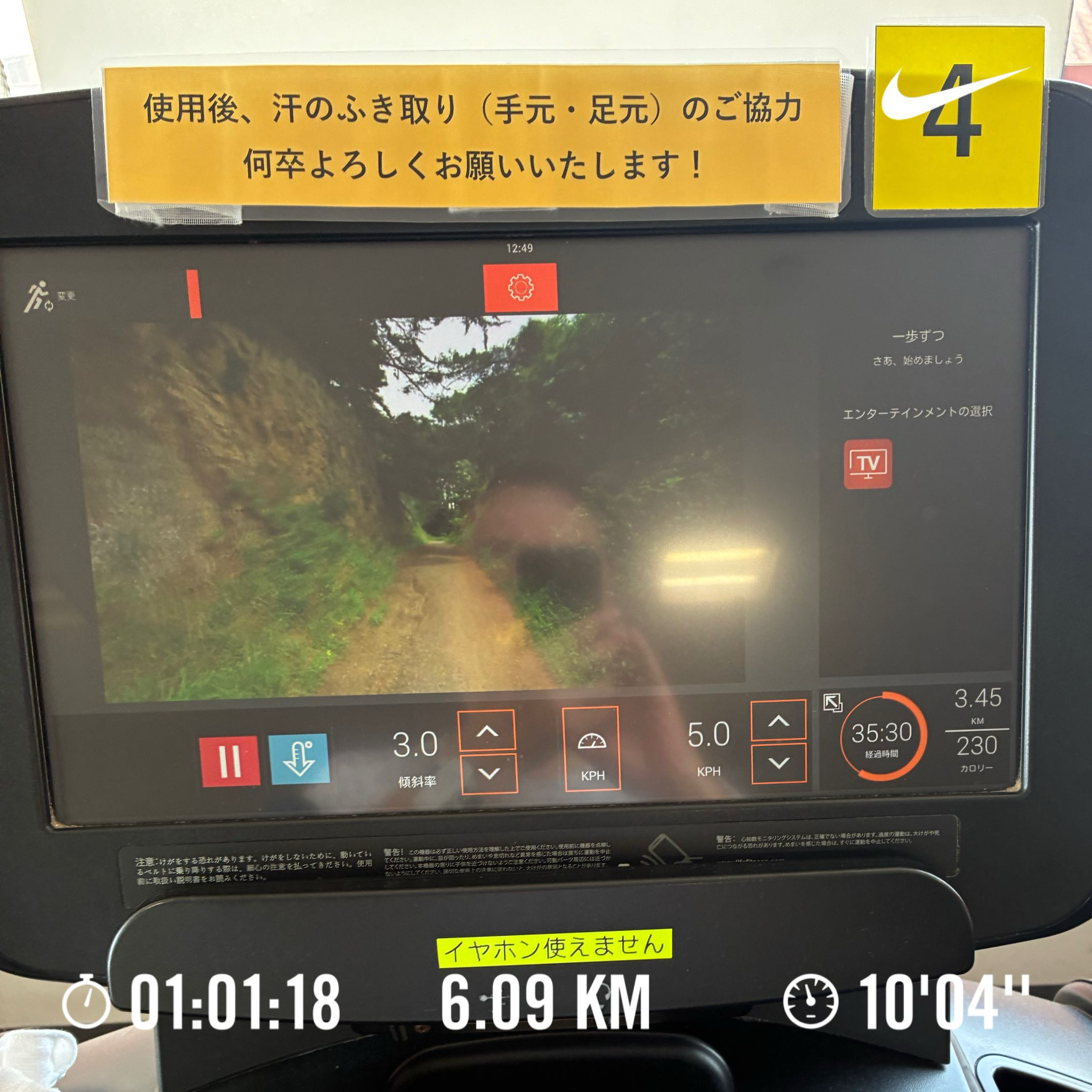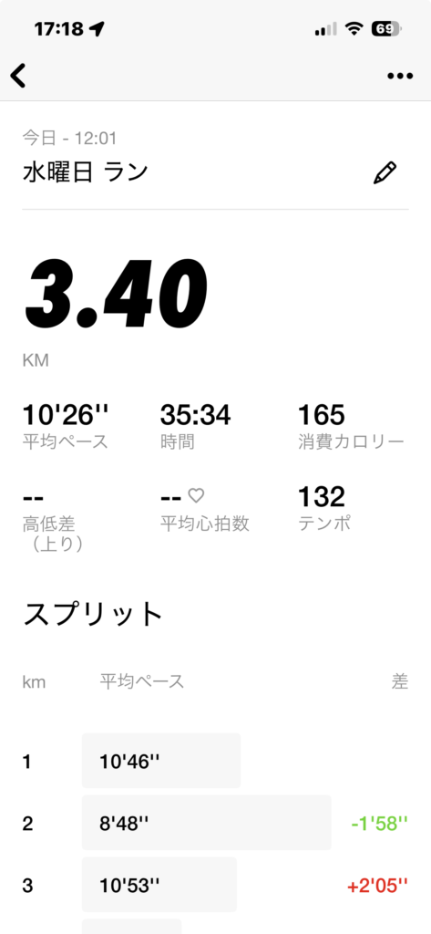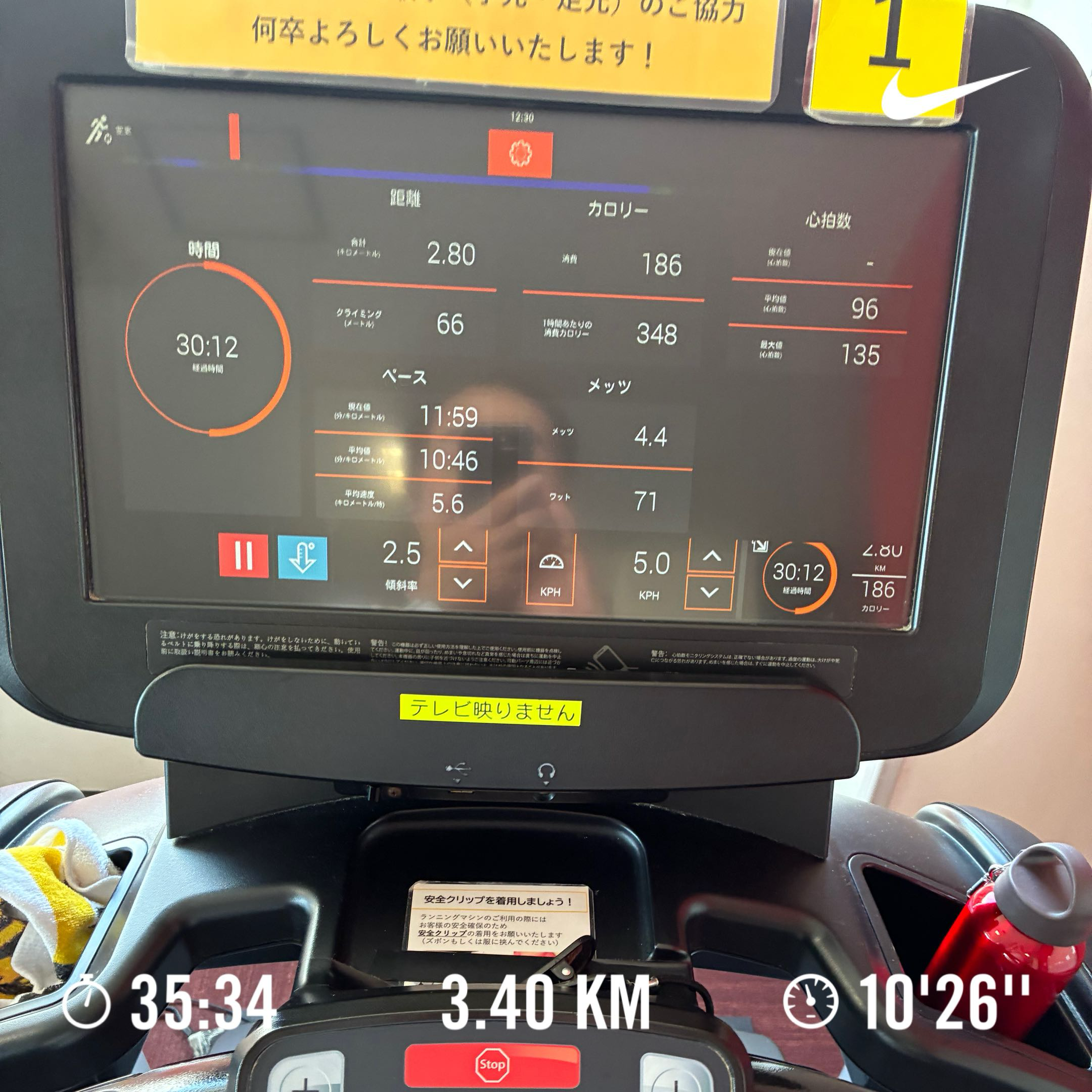 トレッドミル:35分、距離:3.4km、ペース:キロ10分26秒