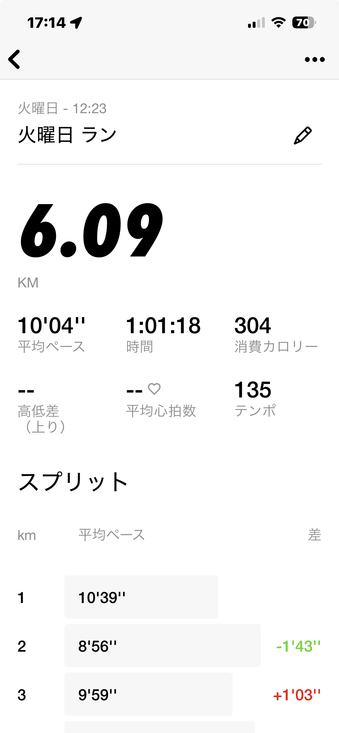トレッドミル:61分、距離:6.1km、ペース:キロ10分4秒