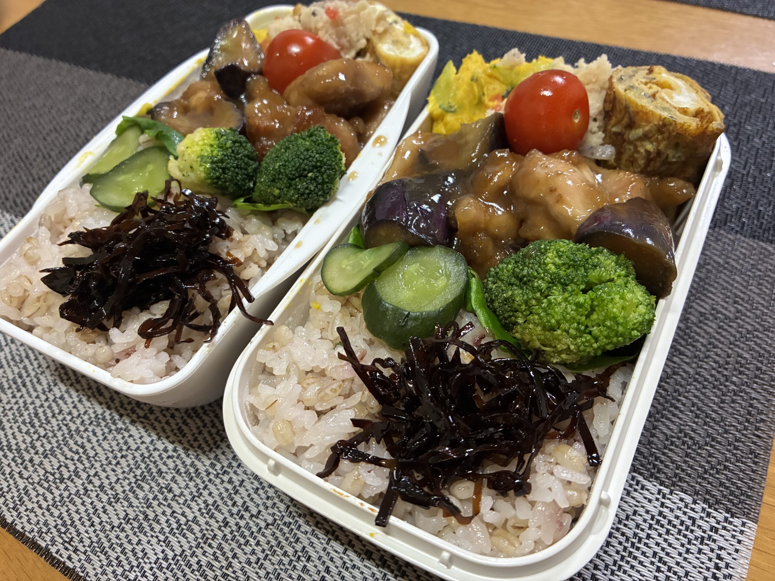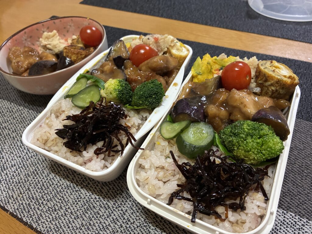 主菜の鶏もも+茄子でたんぱく質とエネルギーを確保し、卯の花・かぼちゃサラダ・ブロッコリーで食物繊維とビタミンがしっかり補えています。漬物と昆布でミネラルも入り、家庭弁当としては非常に理想的な構成です。味の系統も「甘酢・和惣菜・サラダ」と分かれているので食べ飽きにくいのも良い点ですね。
