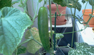 キュウリはなんとか実がなったんです。写真は4本目と5本目のキュウリ