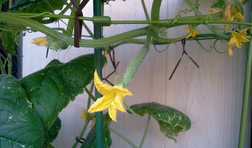 ベランダの菜園で、ようやく、赤ちゃんキュウリ が生えてきました。花はいっぱい咲いてたのになかなか実が出てこないなぁって心配だったんです。よかったよかった。
