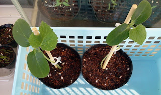 キュウリは本葉が大きく開いてきて、もうふた葉よりも大きくなりました。支柱は竹串では長さが足りなくなったので、今は割り箸の支柱です。