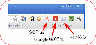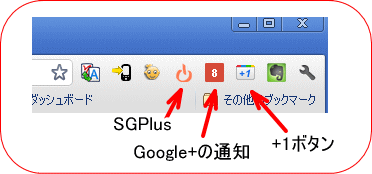 で、Google+ の使い方をいろいろ調べていて、便利な機能を見つけて試してみたので紹介します。Google Chrome にプラグインして使う拡張機能 3つです。インストールすると下記のように、Chrome の右上にアイコンが表示されます。