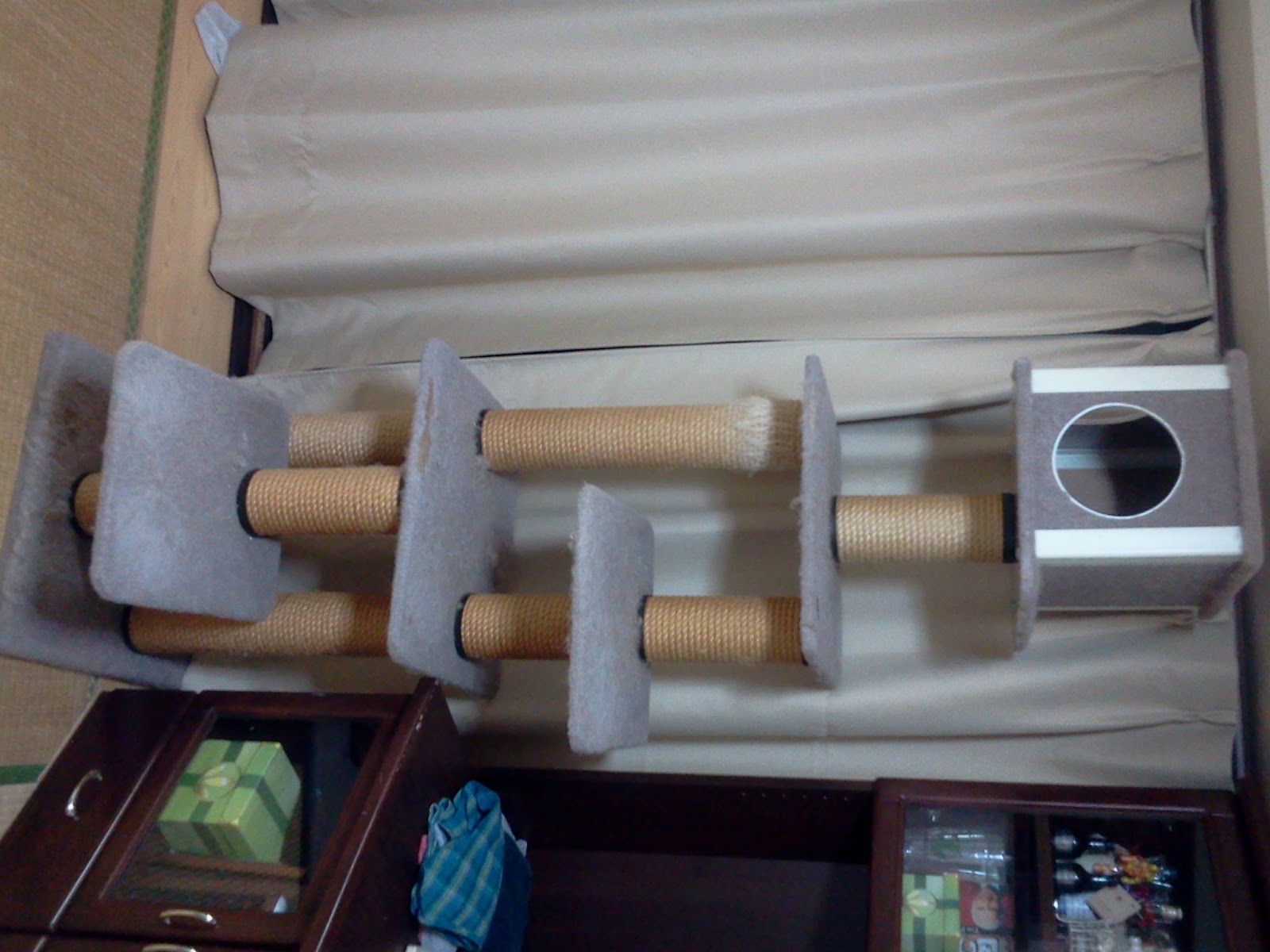 日の当たるところへ、置くこと・・それと、またたび・・・使いましょう。新しいもの・・・またたびでならしましょう。ボックスや縄や、板の上・・またたび巻きましょう。なわはすりこむこと。