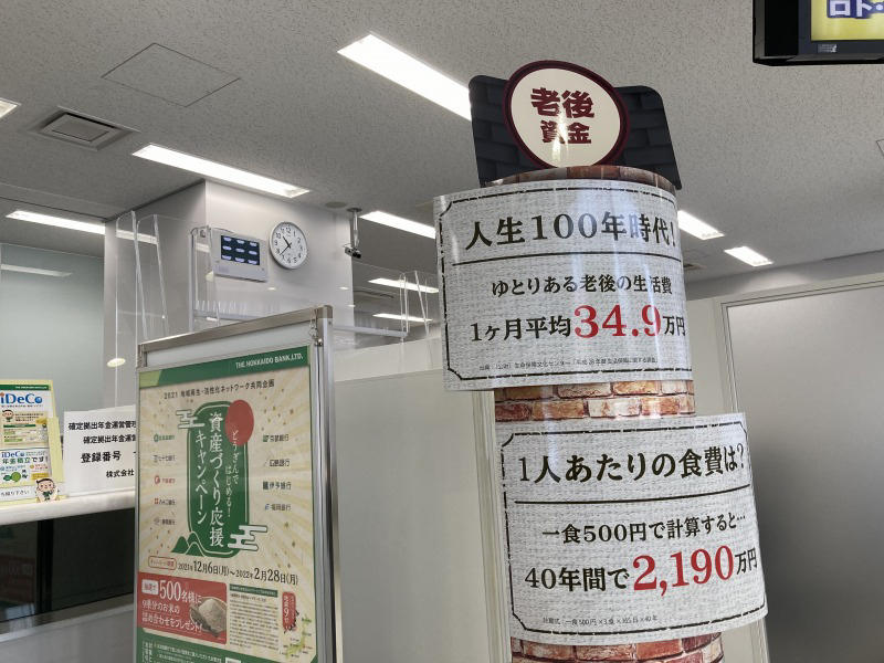 ふと見ると「老後資金」の張り紙。