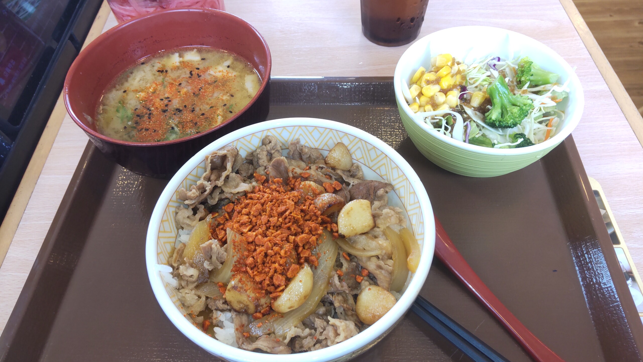今日のお昼は、すき家にて〖にんにくファイヤー牛丼〗+サラダ・豚汁セット 実家の方には飲食店らしきものが無いし、誰か住んでる訳でもないからゴミあまり出せないし、どうしても簡単に食べられるものになってしまって(笑)