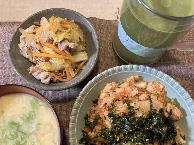 キムチのピリ辛と、青汁のほんのり優しい甘さがぴったりでしたー♪ 緑の栄養もしっかりとれるし、ごはんのお供にもグー💛